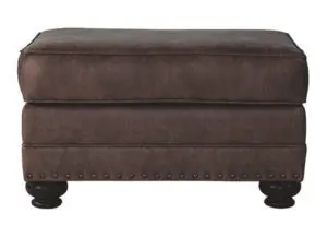• Refined Lodge Collection in multiple leather look fabrics and nailhead finishes. Its extra padded silhouette is further defined by the outline of the nailheads, self welt and top stitched back cushions.